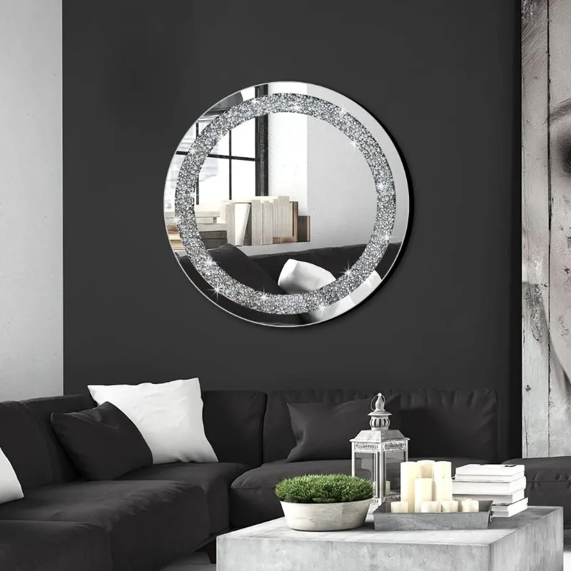 Product size: 20x20x1 inch. Round frameless design with Sparkle Twinkle Bling Crystal Crush Diamond. Wall decorative mirror. Classic design sophisticated, modern and pretty. Exceptional quality right amount of glitz.